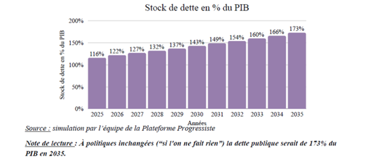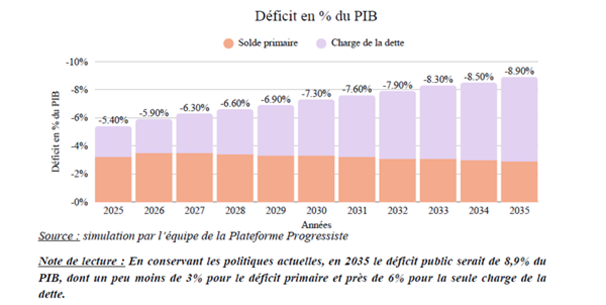 La conférence fait le constat que « la trajectoire dégrade progressivement l’efficacité de la dépense publique et place durablement le pays dans une impasse fiscale. […] » Une trajectoire d’autant plus préoccupante que « la croissance économique ne permet plus d’en neutraliser les effets. » Ainsi la croissance n’est désormais plus suffisante pour compenser l’augmentation de la charge des intérêts de la dette, conduisant celle-ci à s’auto-entretenir. C’est l’effet « boule de neige ». Dans cette perspective à horizon 2035, la simple dérive des comptes publics aboutirait à un déficit public de 8,9 % du PIB, dont un solde primaire autour des 3 % et une charge de la dette de 6 % (soit près du double). Corrélativement, l’endettement dans ce scénario fictif atteindrait à cet horizon les 173 %, puisque « le déficit primaire ne diminu[ant] pas, la trajectoire s’auto-entretien[drait] du fait de l’augmentation progressive des taux d’intérêt. » Stabiliser la trajectoire de la dette nécessiterait alors a minima de supprimer le déficit primaire (ou à tout le moins d’atteindre le solde stabilisant ndlr) et ce, de façon structurelle.