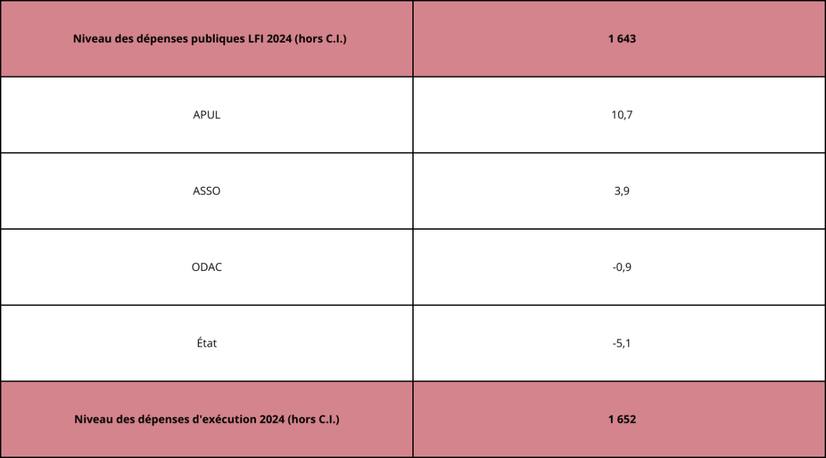 L’augmentation de +9 milliards d’euros en exécution en 2024 par rapport à la LFI est imputable d’abord aux Administrations publiques locales (collectivités territoriales et leurs satellites) pour 10,7 milliards d’euros devant les administrations de sécurité sociale (ASSO) +3,9 milliards d’euros, alors même que l’État et ses opérateurs (ODAC) dégageaient des économies en exécution de près de 6 milliards d’euros par rapport à la LFI 2024.