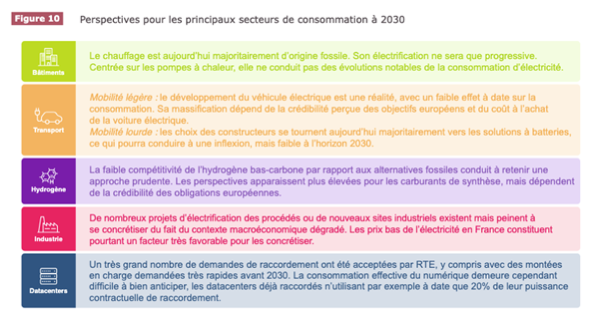 Les principaux leviers d’électrification des usages sont désormais bien identifiés : ce sont les transports (développement des véhicules électriques), l’électrification dans l’industrie, le logement et le développement des datacenters. Selon RTE de nombreux projets devraient se concrétiser dans l’hydrogène, l’industrie et les datacenters.