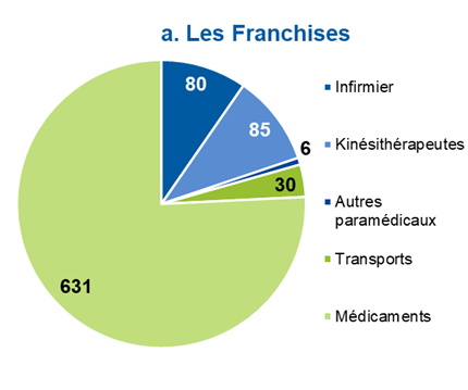 Les médicaments représentent en 2023 les trois quarts des montants dus au titre des franchises médicales. Le reste est dû au titre des actes d’infirmiers et de kinésithérapeutes, et dans une moindre mesure, au titre du transport sanitaire. Concernant les participations forfaitaires, un peu moins de la moitié des montants dus le sont au titre des analyses de biologie médicale, et le reste se partage entre dépenses de médecine générale et de médecine spécialisée.