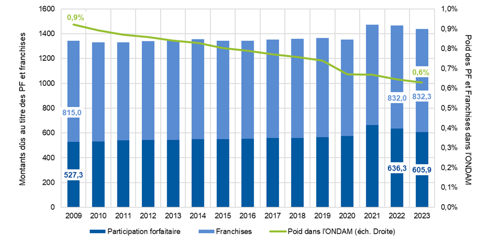 La relative stabilité des montants dus au titre des PF et des franchises, combinée à une croissance de l’ONDAM, a conduit à diminuer leur part dans l’ONDAM, explique la DSS : en 2009, ces dispositifs représentaient 0,9 % de l’ONDAM contre 0,7 % en 2019, avant la crise, et 0,6 % en 2023.