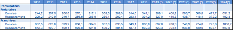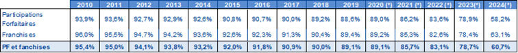 Le tableau présente pour le régime général les taux de recouvrement des participations forfaitaires et franchises pour la période de 2010 à 2024. Il est important de noter que le recouvrement pouvant avoir lieu jusqu’à 5 ans après le fait générateur, les données pour les années de 2020 à 2024 restent incomplètes. Après 5 ans, ces créances sont annulées.