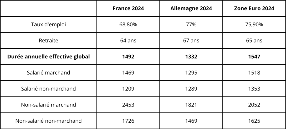 Selon les chiffrages de la Fondation IFRAP, en partant des données Eurostat, aligner le temps de travail sur la moyenne de la Zone Euro permettrait de gagner près de 7,6 milliards d’heures travaillées par an, et près de 7,4 milliards en s’alignant sur le modèle allemand. Les données d’Eurostat indiquent que les Français ne sont pas réfractaires au travail, mais que la moyenne d’heures effectives travaillées par an reste inférieure à celle de la Zone Euro, principalement en raison du faible temps de travail des salariés du secteur non marchand. Les solutions les plus pertinentes aujourd’hui seraient d’augmenter le temps de travail des salariés du secteur public, d’accroître le taux d’emploi dans le pays et de pousser l’âge de départ à la retraite.