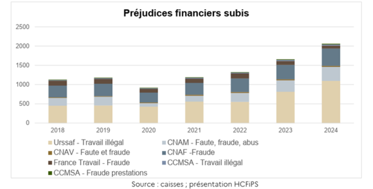 Les préjudices subis et constatés par les organismes sociaux représentent 2,5 Md€ si l’on y ajoute les fraudes évitées, 2,06 Md€ si l’on ne retient que les fraudes détectées et stoppées. Ces chiffres sont à comparer aux chiffres de l’année précédente, 2,12 Md€ de fraudes détectées, stoppées et évitées en 2023 et aux 1,65 Md€ pour la seule fraude détectée et stoppée cette même année.