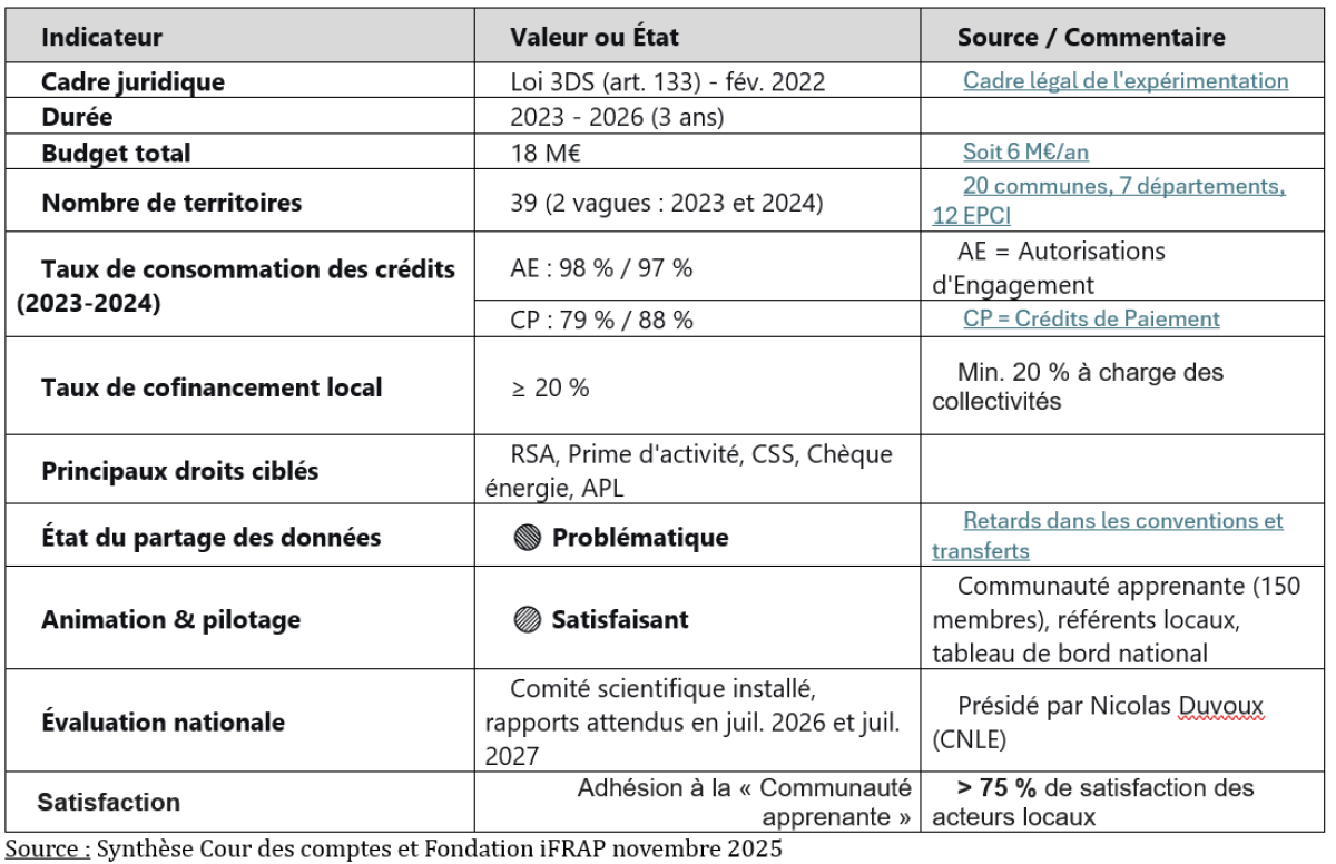 Le rapport d’octobre 2025 de la Cour dresse un bilan d’étape de l’expérimentation « Territoires Zéro non-Recours » qui doit se poursuivre pendant une durée de 3 ans. Il ne juge donc pas encore les résultats de l’expérimentation – dont l’évaluation devrait être lancée 12 mois avant la fin de l’expérimentation[1] – mais constate son démarrage effectif malgré l’identification de défis significatifs, notamment s’agissant du partage de données entre les différents acteurs institutionnels sur le terrain.