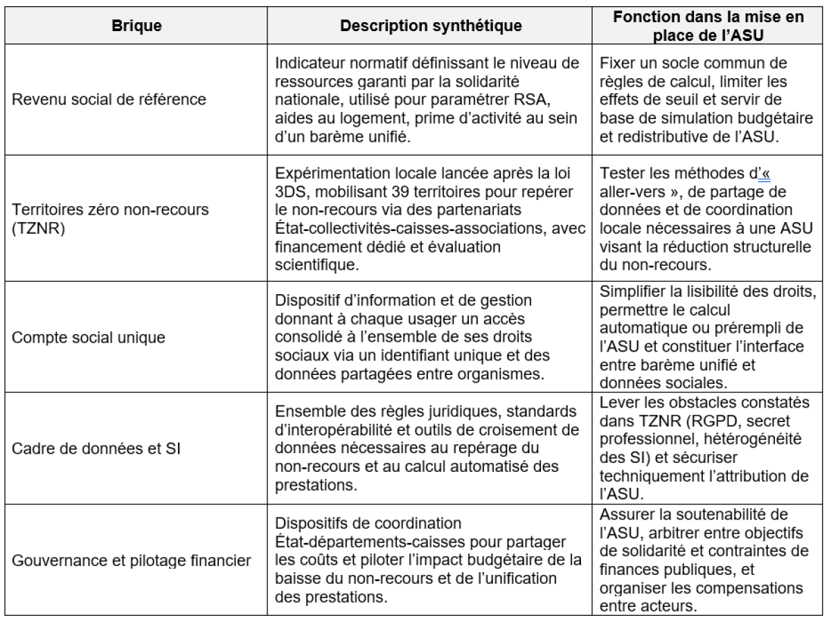 La mise en place d’un tel compte suppose précisément de traiter les obstacles mis en lumière par TZNR : gouvernance des données, interopérabilité entre opérateurs (CAF, MSA, caisses de retraite, collectivités, services de l’emploi), et sécurisation juridique des flux d’information. Dans la perspective d’une ASU, le compte social unique serait l’interface où se matérialisent le revenu social de référence (barème cible) et la réduction du non‑recours (via des alertes et droits automatiquement calculés) via le recueil de la capitalisation des droits ouverts disponibles pour le bénéficiaire.