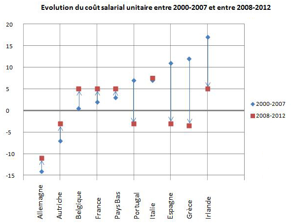 L'évolution de la compétitivité dans les différents pays montre qu'il faut distinguer deux périodes. A partir du milieu des années 1990 environ, la productivité augmente de la même façon en France, Allemagne et Autriche, mais en France les salaires augmentent au même rythme que la productivité alors que dans les deux autres pays le coût réel du travail est en baisse (réformes Hartz/Schröder en Allemagne au milieu des années 2000), si bien qu'au total le coût unitaire baisse fortement. A partir de 2008 la situation change. La productivité cesse d'augmenter dans les pays dits nordiques, France compris, alors qu'elle augmente très fortement dans les pays dits du Sud, particulièrement en Espagne et sauf en Italie. Les salaires quant à eux augmentent de façon à peu près identique dans les pays du Nord, qui doivent faire un effort en jouant sur la baisse de leurs marges, ce qui s'applique à la France, mais aussi à l'Allemagne dans une moindre mesure.