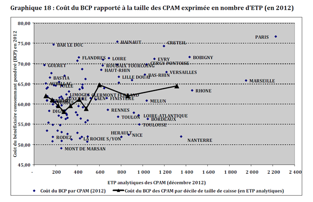 Les Cpam les moins efficientes sont donc celles où il y a trop d’agent par rapport à l’activité de la caisse[2]. Pour l’Igas-IGF, la taille critique minimale d’efficience d’une Cpam est la gestion de 170.000 bénéficiaires consommants pondérés et les Cpam gérant moins de BCP présentent les rations les plus faibles de BCP/ETP. On le voit bien sur ce graphique, la Cpam de Paris gère environ 820 BCP/ETP (ordonnées) pour plus de 1,8 million de BCP (abscisses) et est 101 sur 102 au classement de productivité.
