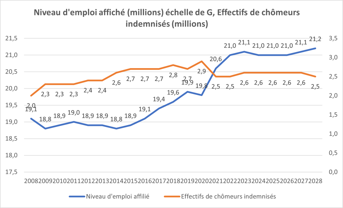 Cette évolution conduirait à une croissance en valeur plus basse que dans le scénario retenu en octobre pour les années 2026 et 2027. Mais cette situation, qui impacterait la masse salariale cotisante, serait compensée par un niveau d’emploi affilié en hausse de +220 000 entre 2026 et 2028 à 21,2 millions. Dans le même temps, les effectifs de chômeurs indemnisés baisseraient d’environ 100 000 bénéficiaires, à 2,5 millions à horizon 2028. Il s’agirait donc d’une prolongation de la dynamique à l’œuvre depuis 2021, avec un niveau d’emploi supérieur à 21 millions contre 19,9 millions en 2019, et une population de chômeurs indemnisés qui, elle, s’établirait autour des 2,6 millions, voire 2,5 millions seulement en 2028.