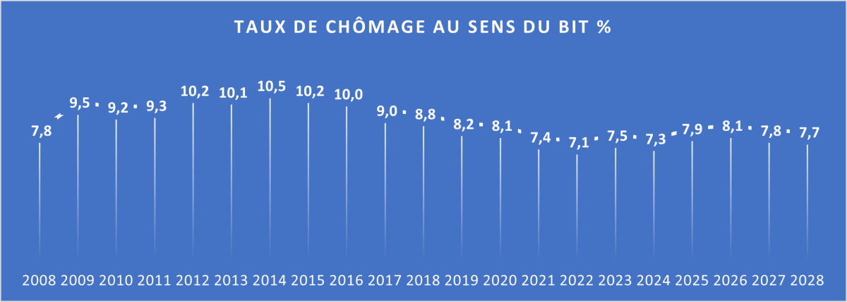 En revanche, le niveau du chômage au sens du BIT augmenterait de 0,2 point en 2026, passant de 7,9 % de la population active à 8,1 %. Le volume de chômeurs refluerait ensuite en 2027 et 2028 pour toucher 7,7 % de la population active, là encore « sous l’effet de la reprise modérée de l’emploi et du moindre dynamisme de la population active en lien avec la suspension de la réforme des retraites. » En 2028, la baisse se poursuivrait en revanche grâce à « l’accélération attendue des créations d’emplois salariés ».