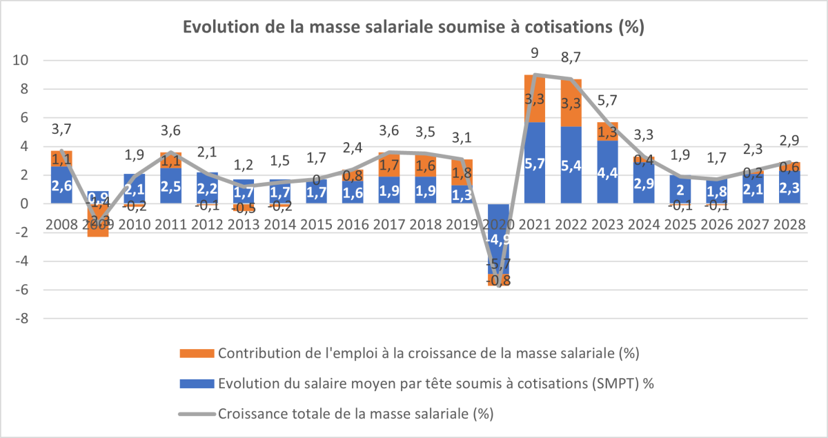 La croissance économique contribue à celle de la masse salariale au travers de la « contribution de l’emploi », tandis que l’inflation, elle, y contribue à travers de l’évolution du salaire moyen par tête soumis à cotisations (SMPT). Il en résulte une croissance totale de la masse salariale qui croîtrait entre 2026 et 2028, passant de +1,7 % à +2,9 % sur la période.