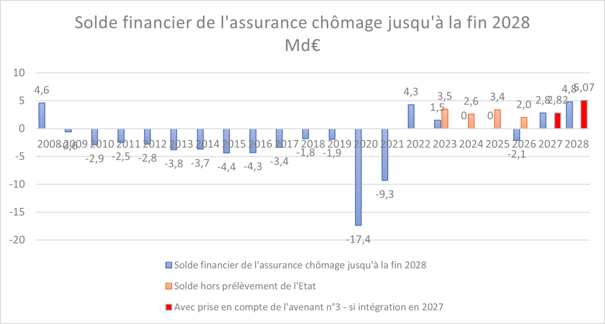Il en résulte un prélèvement qui monte en puissance, s’échelonnant entre 0,1 Md€ en 2023 et jusqu’à 0,3 Md€ en 2026. Ensuite, le budget de l’Unedic en répondrait directement malgré l’arrêt des prélèvements de l’Etat (via non-compensation des exonérations), pour un montant de 0,4 Md€/an jusqu’en 2028 comme le prévoit la convention tripartite.
