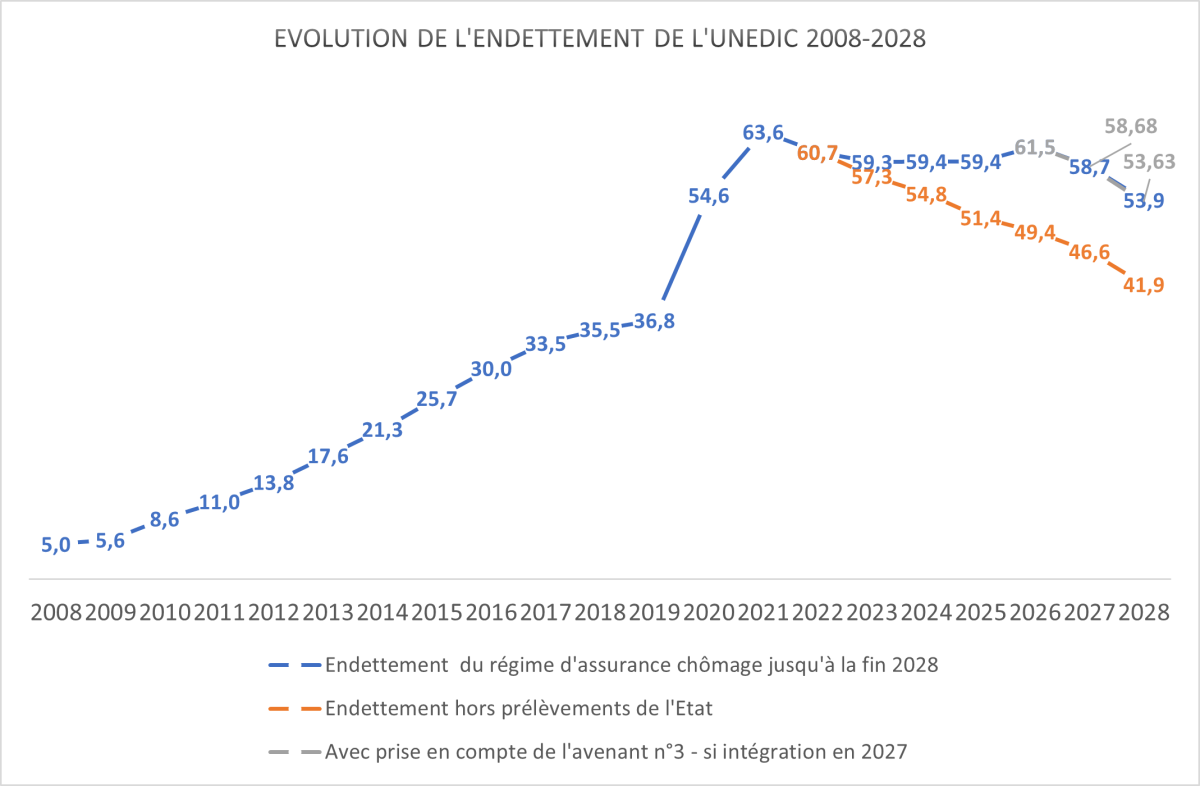 La question de la dette du régime est sensible. La crise sanitaire avec les effets du chômage partiel a creusé l’endettement de l’Unedic de près de 27 Md€. Depuis 2023, le remboursement des créances est difficile alors que les intérêts de la dette croissent et pourraient atteindre le milliard d’euros à horizon 2028. Le rapport précise que « entre 2025 et 2026 l’Unedic a dû augmenter ses programmes d’endettement à long terme pour compenser les prélèvements de l’Etat (…), les charges d’intérêt associées (environ 1 Md€ entre 2023 et 2027) et le surfinancement de France Travail qui en résulte ». En effet, la réforme de France Travail a transformé Pôle Emploi en organisme généraliste animateur du réseau de la recherche d’emploi sur l’ensemble du territoire (sans fusion avec les maisons de l’emploi et les missions locales, etc.), et doit accepter l’inscription des bénéficiaires du RSA dans ses registres (politique d’activation). L’Unedic doit lui verser « un peu plus de cinq milliards d’euros » par an à ce titre[3]. Son poids, en effet, augmente et très concrètement, France Travail qui recevait 4,3 Md€ de subventions en 2023 en reçoit désormais 5,2 Md€ en 2026 et devrait en recevoir même 5,3 Md€ en 2027[4].