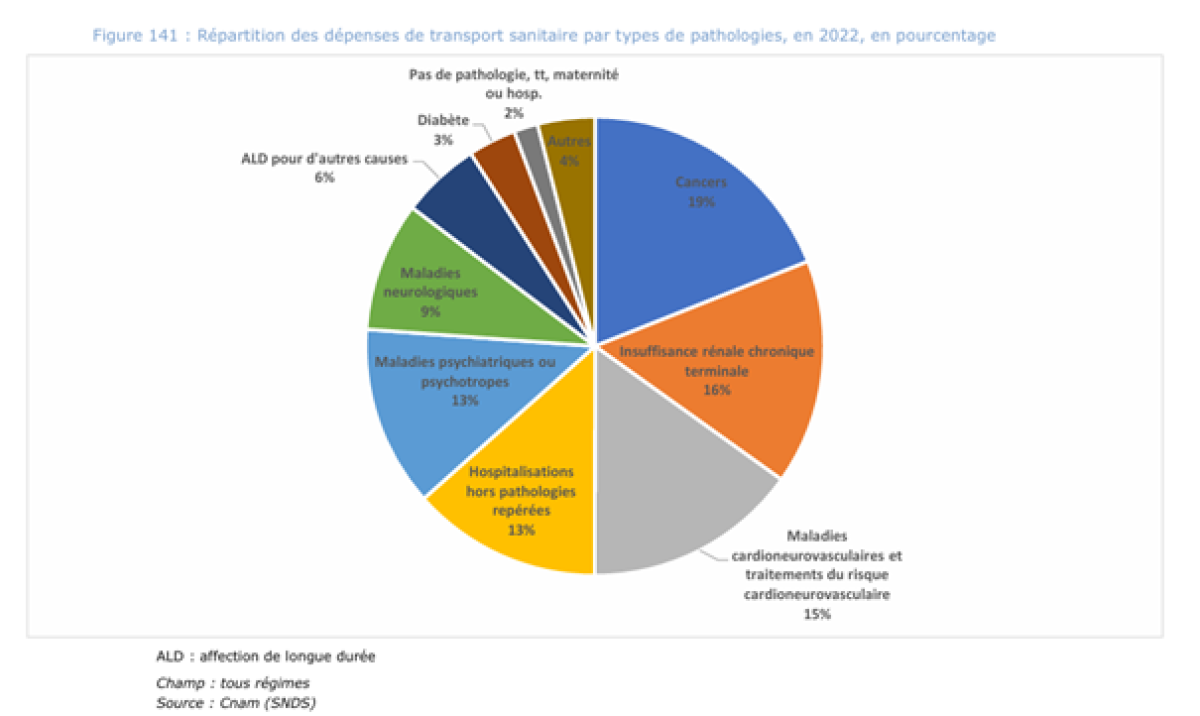 Ainsi, les dépenses de transport sanitaire reposent presque exclusivement sur la Sécurité sociale. Puisque ce sont majoritairement les ALD qui bénéficient des transports sanitaires et que la Sécurité sociale prend ces frais en charge à 100 %, elle finance en 2024 93,2 % des dépenses de transports sanitaires, contre uniquement 3,5 % pour les complémentaires santé, selon la DREES.