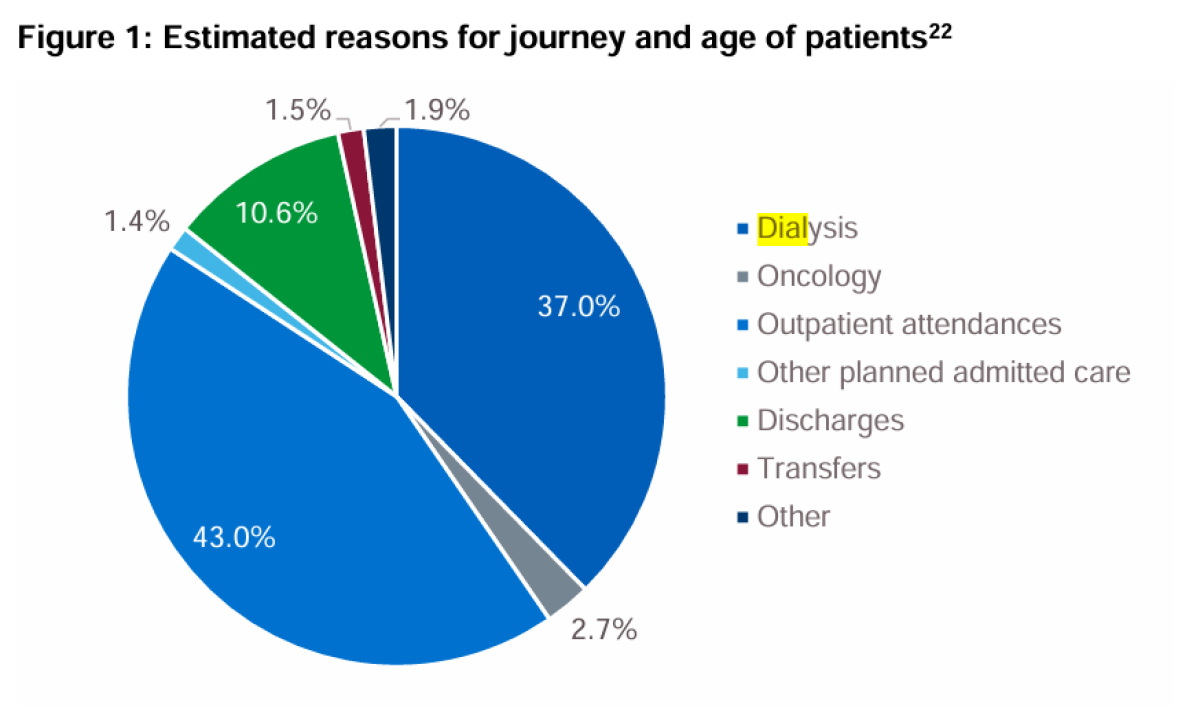 Ainsi, la prise en charge des transports pour les personnes atteintes de pathologies chroniques n’est pas systématique au RU. Elle dépend plutôt de l’état de santé du patient. Seuls les patients recevant un traitement d'hémodialyse reçoivent automatiquement une prise en charge par le NHS des transports pour tous les trajets aller-retour vers les centres d'hémodialyse.