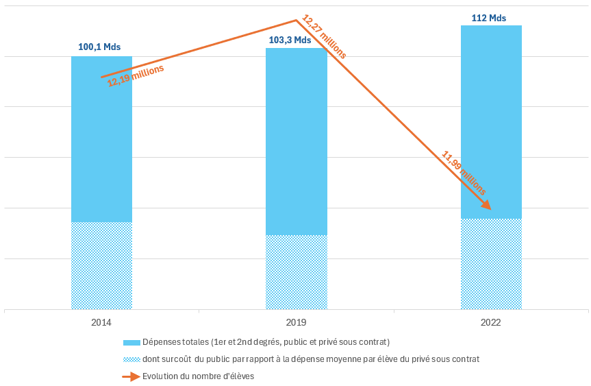 +8,7 milliards d'euros depuis 2019. Le train des dépenses pour le 1er degré et le 2nd degré, public et privé sous contrat, s'emballe par rapport à la période précédente, passant d'un rythme de +1,9 milliard/an entre 2016 et 2019 à +2,2 milliards entre 2019 et 2022. Un emballement des dépenses principalement porté par l'augmentation de la masse salariale du personnel non enseignant ainsi que les dépenses de fonctionnement de l'enseignement public assurées par les collectivités territoriales. Une dérive qui, dans un contexte de baisse du nombre d'élèves et de baisse à venir du nombre d'enseignants, doit nous interpeller. D'autant plus que l'enseignement privé continue de creuses l'écart en assurant les mêmes missions pour un coût inférieur de 32% en moyenne, tout financeurs confondus.