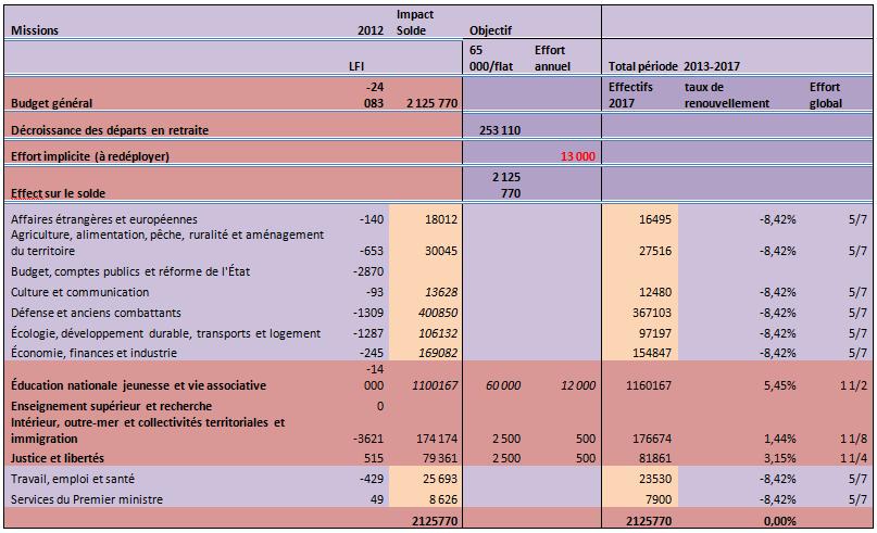 Entre 2012 et 2017, selon nos estimations, près de 253.110 agents de l'État partiront en retraite. Si l'on considère que les ministères de l'Éducation, la Police, la Gendarmerie et la Justice verront tous leurs départs remplacés (130.000 pour l'Éducation, 9.449 pour la Justice, 20.738 pour la Police/Gendarmerie), le non renouvellement équilibrant les créations de postes dans l'Éducation nationale, la Justice et la Police ne pourra plus jouer que sur 91.928 départs en retraite dans les autres administrations. Dans les 7 missions principales de l'État (voir tableau), cela impliquerait de ne renouveler que 26.928 personnels sur 91.928.