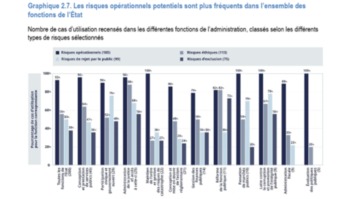 Il faut dire que ces tâches confiées partiellement à l’IA ne sont pas exposées aux mêmes risques. De manière générale, l’OCDE reconnait des risques éthiques (biais algorithmiques quant au libre exercice des droits humains), des risques opérationnels (défaillances techniques ou fonctionnelles), des risques d’exclusion (si les citoyens n’ont pas accès aux technologies), des risques de résistance de la population (à l’utilisation de l’IA par les pouvoirs publics), et des risques d’inaction (retards pris par les pouvoirs publics dans l’adoption de l’IA alors qu’elle pourrait générer des bénéfices importants, entraînant des coûts financiers important liés à la procrastination, qui se manifestent comme un écart entre les capacités du secteur public et celles du secteur privé).