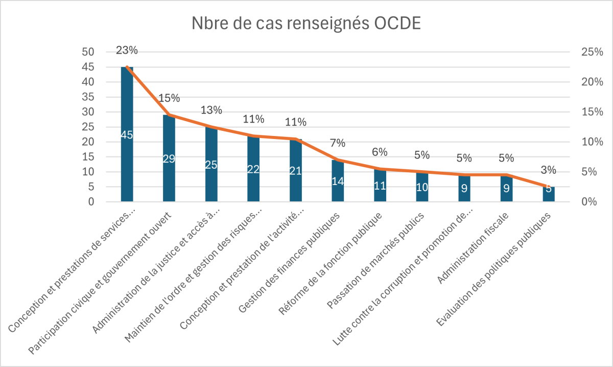 Cela explique ainsi que sur près de 200 cas d’utilisation dans 11 fonctions de l’Etat, celles-ci soient si inégalement réparties. L’évaluation des politiques publiques, les tâches de l’administration fiscale, de lutte contre la corruption et de passation des marchés publics ne représentent que 5 % des déploiements, ou moins. En revanche les tâches de conception et de prestation de service regroupent près de 23 % des cas d’utilisation, tout comme les tâches liées à la participation civique et au gouvernement ouvert (15 % des cas), ou d’accès et d’administration de la justice (13 % des cas). Relevons par ailleurs que 11 % des cas ressortent de tâches relatives au maintien de l’ordre, comme celles relatives à la conception et aux prestations d’activités réglementaires, et 7 % des cas relèvent de la gestion des finances publiques.