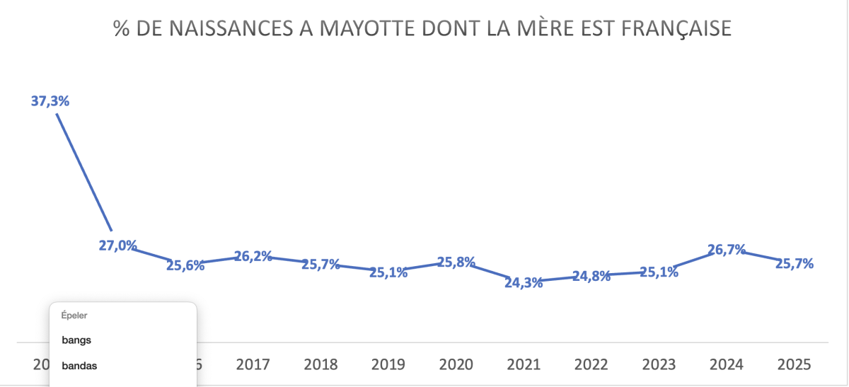 Et la particularité de cette poussée démographique est qu’elle est largement d’origine étrangère : comorienne d’abord (puisque Mayotte est distante de 70 km de la plus proche île de l’archipel des Comore), mais aussi depuis le début des années 2020 de l’Afrique des grands lacs. D’après les estimations de la mission sénatoriale, près de la moitié de la population est d’origine étrangère et la moitié de ces étrangers sont en situation irrégulière en 2017. En extrapolant ces chiffres, cela fait aujourd’hui entre 80.000 et 100.000 personnes en situation irrégulière, pour 160.000 à 200.000 étrangers résidents à Mayotte. Cette croissance reposant comme l’évoque l’INSEE « sur le dynamisme des naissances » lié à l’immigration dans la mesure où seulement 26,6% en moyenne des naissances intervenues entre 2014 et 2025 étaient de mères françaises. On recense par ailleurs en moyenne 6 enfants/femme pour les mères nées à l’étranger contre 3,5 pour les femmes nées à Mayotte.