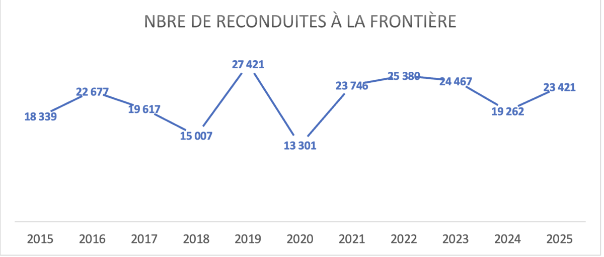 On y trouve en particulier les statistiques de reconduites à la frontière, soit 23.421 en 2025 contre 19.262 en 2024 (+26,7%), qui constitue une reprise après le cyclone Chido qui avait détruit une partie du matériel de repérage et d’interception (2 vedettes, ainsi que la destruction de plusieurs radars). S’agissant des interceptions en mer, celles-ci ont représenté 390 embarcations (Kwassas) en 2025, permettant l’interpellation de 240 passeurs et de 4.584 étrangers en situation irrégulière. Le rapport de la préfecture précise que « la LIC « mer » a été fortement ralentie au début de l’année 2025 (janvier/février) par la destruction d’une grande partie du système de détection des embarcations par le cyclone Chido. » Les interceptions sont plus faibles qu’en 2024 (493 embarcations saisies) et 6.764 étrangers en situations irrégulières interpellés en mer[4].