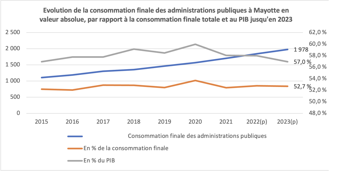 En 2023, la consommation finale des administrations publiques à Mayotte représentait 1,978 Md€, soit 57% du PIB et 52,7% de la consommation finale totale. Le PIB étant augmenté de la formation brute de capital fixe (investissements publics et privés), mais diminué du solde extérieur, or Mayotte importe énormément (pour 1,26 Md€ en 2023 contre seulement 94 M€ d’exportation). Ce chiffre est toutefois plus important si l’on y inclus les ISBLSM (institutions sans but lucratif au service des ménages), c’est-à-dire les différents organisme associatifs ou non qui concourent au développement des politiques publiques. La consommation finale publique atteint alors les 2,087 Md€, soit 60,1% du PIB. En hausse de 7,3% par rapport à 2022.