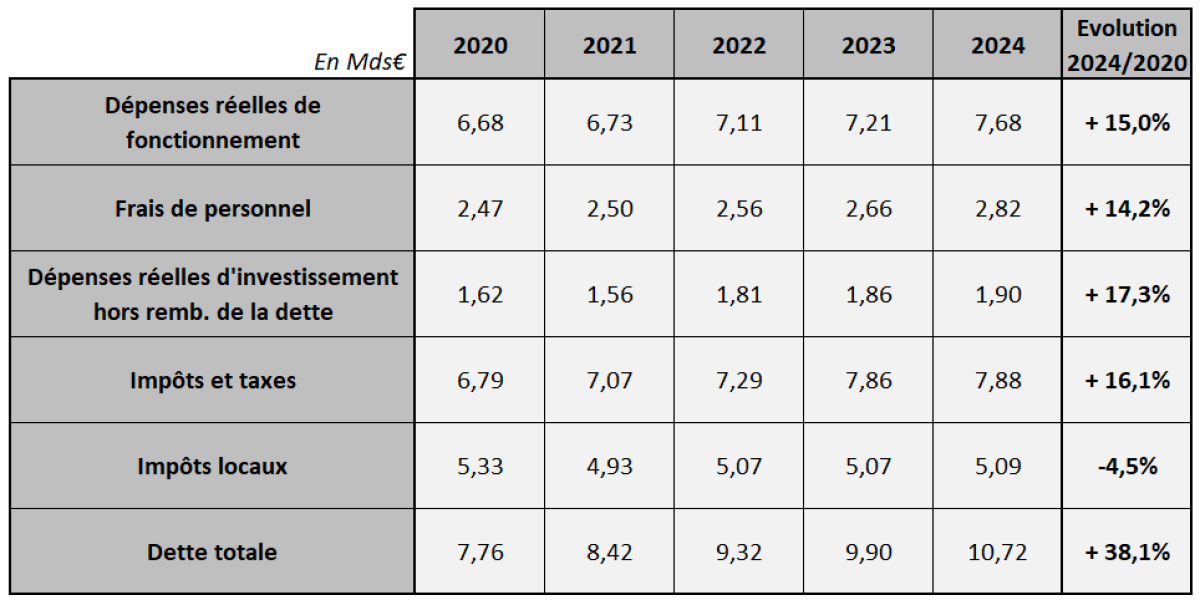 Parmi ces impôts et taxes, les impôts locaux sont en baisse de 2 % depuis 2020. Le montant des impôts locaux par habitant est passé de 2 430 € à 2 392 € entre 2020 et 2024. En 2024, les impôts locaux représentaient 5,1 Mds€.