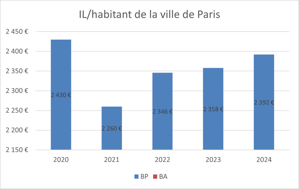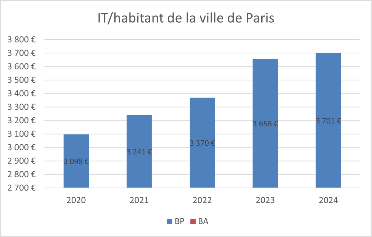 Pour financer toutes ces dépenses, la ville a choisi d’imposer davantage les Parisiens. Le montant des impôts et taxes par habitant a augmenté de 3 098 € à 3 701 € entre 2020 et 2024. Ce montant a donc progressé de 19 % sur la période. Les impôts et taxes représentaient 7,9 Mds€ en 2024.