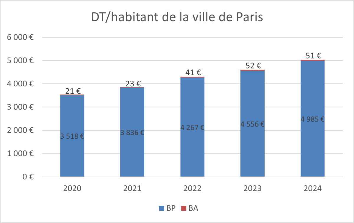 Depuis 2020, les dépenses de la ville de Paris progressent rapidement. Le nombre d'agents continue d'augmenter alors même que la population est, elle, en baisse. Dans le même temps, le montant des impôts et taxes a progressé de 19 %, malgré une imposition locale plus faible qu’en 2020 (mais en hausse depuis 2021). Ces évolutions creusent encore davantage la dette totale de la ville, qui a atteint 10,7 Mds€ en 2024, soit 5 036 € par habitant, en hausse de 42 % depuis 2020. Avec un agent (équivalent temps plein) pour 45 habitants en 2022, Paris emploie largement plus de personnel que la ville de Lyon (un pour 66). Si Paris était alignée sur Lyon en termes de personnel (chiffres de 2022), la ville économiserait environ 780 M€ et emploierait 15 800 agents en moins.