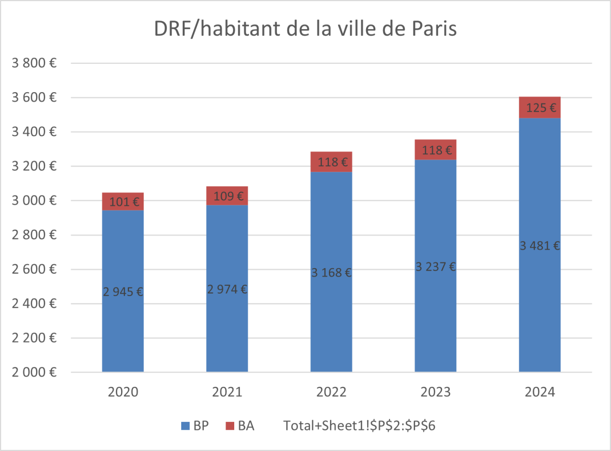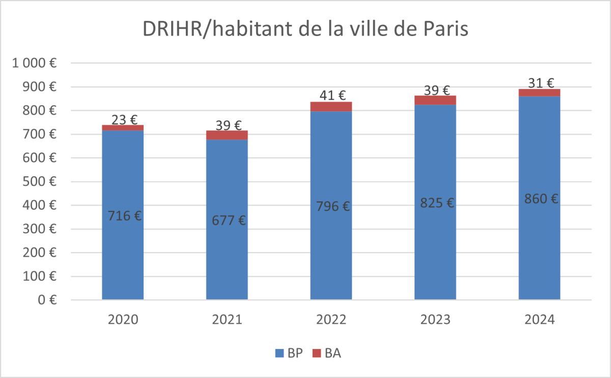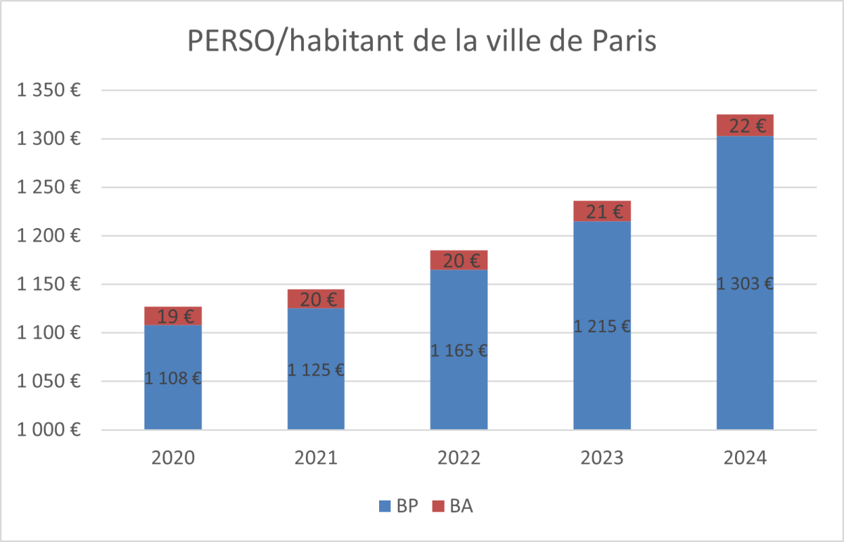 Les frais de personnel (PERSO), inclus dans la dépense de fonctionnement, augmentent au même rythme que la DRF en montant par habitant (18 %). Ces charges passent de 1 127 € à 1 325 € par Parisien. Au total, les frais de personnel ont atteint 2,8 Mds€ en 2024.