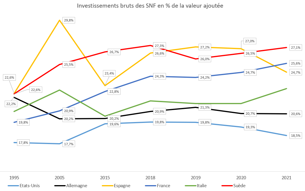 Le même constat vaut pour la capacité d’autofinancement des sociétés non financières. Et donc, sans surprise, l’accumulation brute du capital a été plus faible aux Etats-Unis que dans les autres pays de notre échantillon
