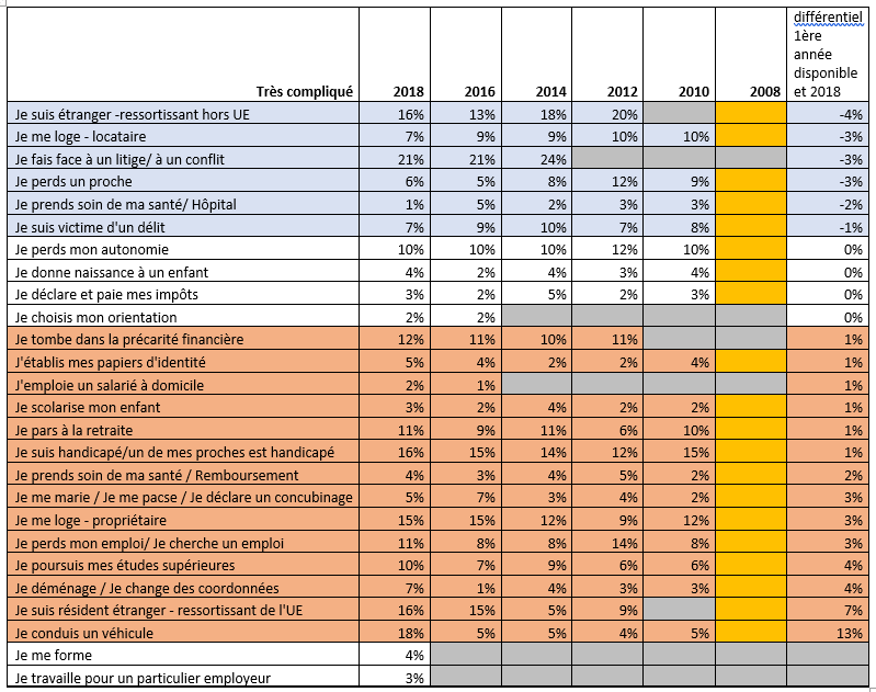 La sommation des événements compliqués et très compliqués apparait globalement en repli par rapport à 2008. En particulier pour les ressortissants étrangers hors UE, dont la complexité diminue de 19 points en 12 ans[2], tout comme la cherche d’emploi. La perte d’un proche et les déclarations consécutives semblent plus simples (-17 points), alors même que le « dites-le-nous une fois » en la matière ne semble pas avoir substantiellement avancé. Idem pour la « naissance d’un enfant », -12 points 2008/2018. Cela témoigne du fait que la numérisation des services progresse (+16 points en huit ans pour la communication administration/administrés) bien que l’interconnexion entre ces mêmes services reste insuffisante.