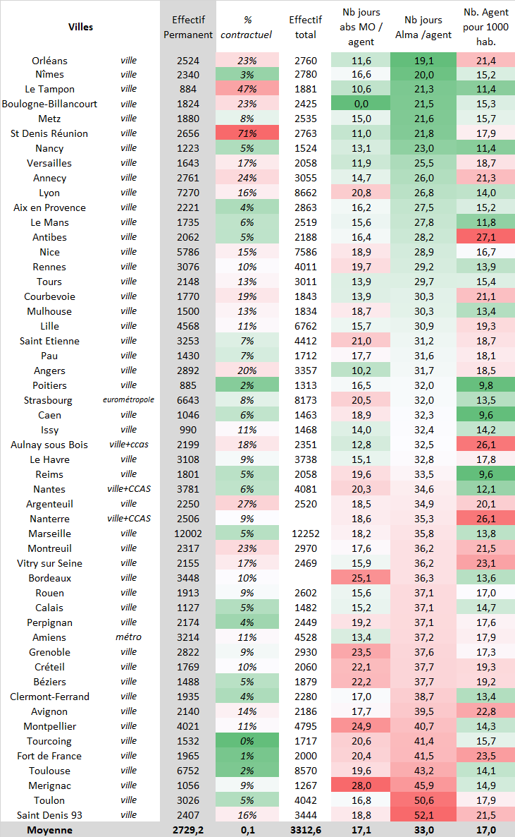 Les villes de Brest, Limoges, Paris, Roubaix, Villeurbanne, Dijon, Aubervilliers, Rueil-Malmaison, La Rochelle, Cannes, Saint-Nazaire, Dunkerque et Saint Paul (Réunion) ne nous ont pas répondu. Au total, 66 villes ont été contactées, 53 nous ont répondu dont Besançon dont le bilan social s'est avéré inexploitable. Cette étude s'appuie donc sur un échantillon robuste de 52 villes représentant 142.000 agents permanents. Il s'agit des plus grandes villes de France elles-mêmes représentant plus de 8,9 millions de Français. Comme nous l'avons fait par le passé, nous avons saisi la CADA – Commission d'accès aux documents administratifs - pour obtenir les données des villes n'ayant pas donné suite à nos demandes.