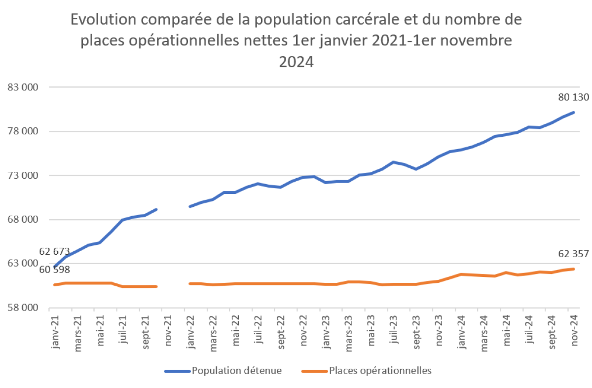 Cette situation pénitentiaire critique s’explique d’abord par la faiblesse de l’augmentation du parc de cellules nouvelles disponibles : entre le 1er janvier 2021 et le 1er novembre 2024, le nombre de cellules disponibles a augmenté de 2,9% (passant de 60.598 cellules à 62.357 cellules, soit +1.759 unités nettes), tandis que la population incarcérée augmentait elle de 27,9% (+17.457 détenus) à 80.130 détenus.