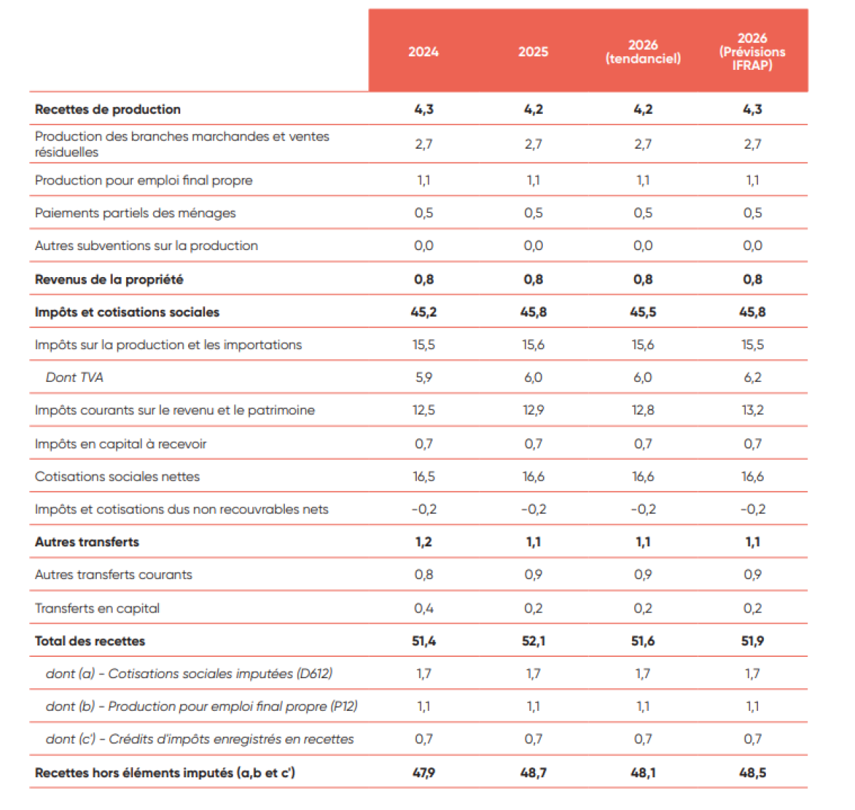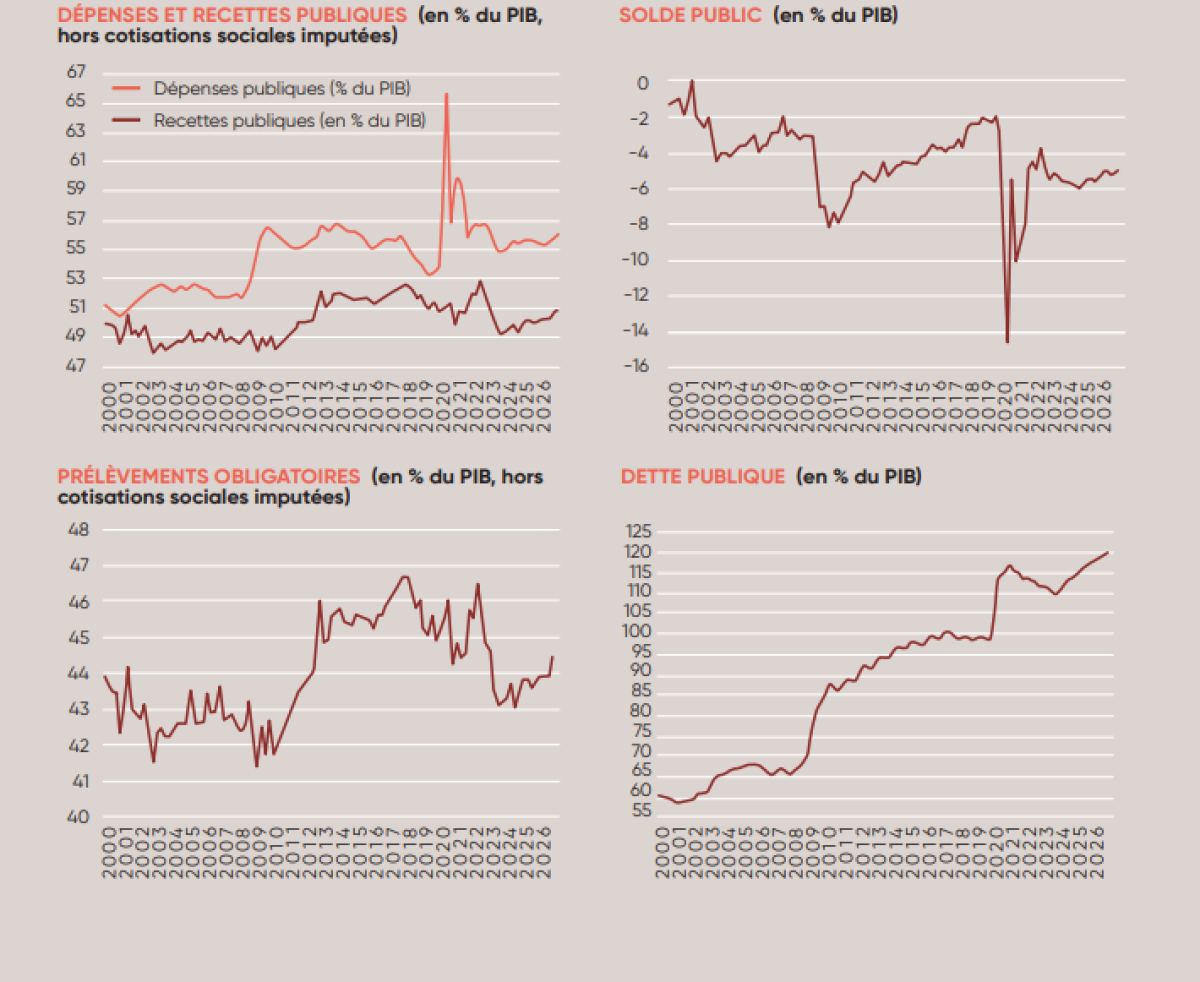 On note une légère baisse du poids des dépenses publiques, mais la plus grosse partie de l'ajustement repose sur la hausse des prélèvements obligatoires, qui augmenteraient de 0,4 point en 2026 par rapport au scénario tendanciel.