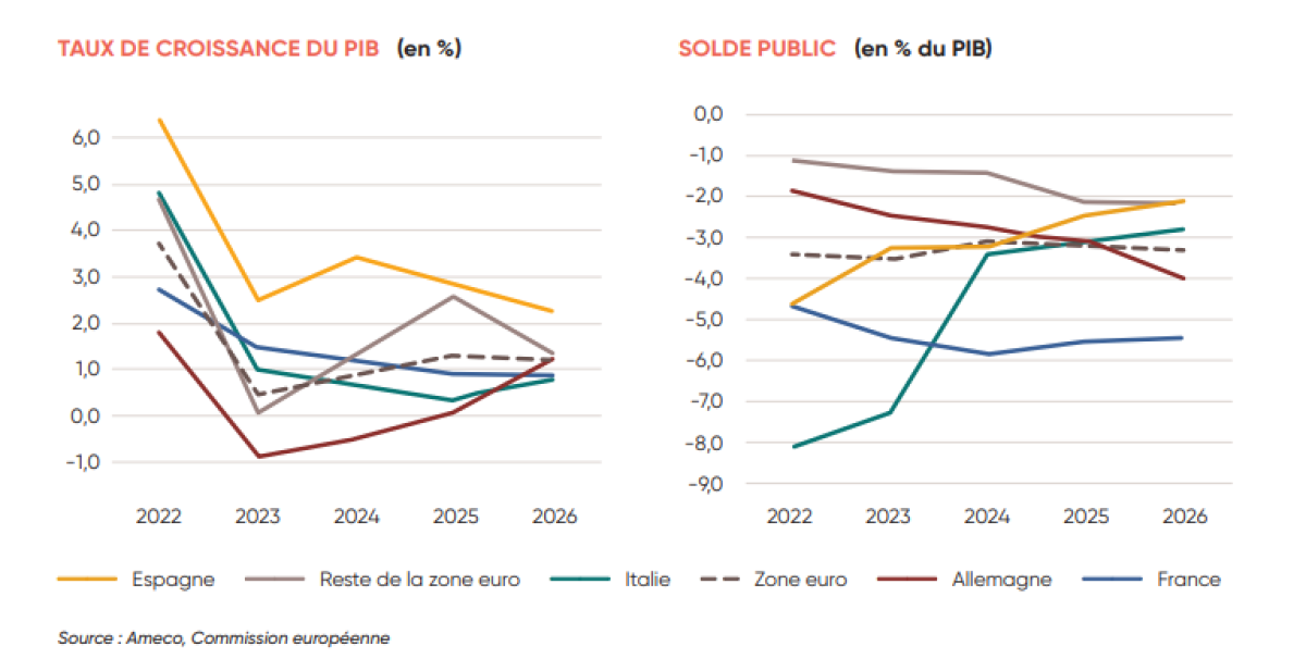 Un regard sur les graphiques ci-dessous permet de prendre conscience de la situation atypique de la France : une relative faiblesse de notre croissance (en-dessous de la moyenne de la zone euro au cours des deux dernières années) associée à une divergence de notre solde public vis-à-vis du reste de la zone euro.