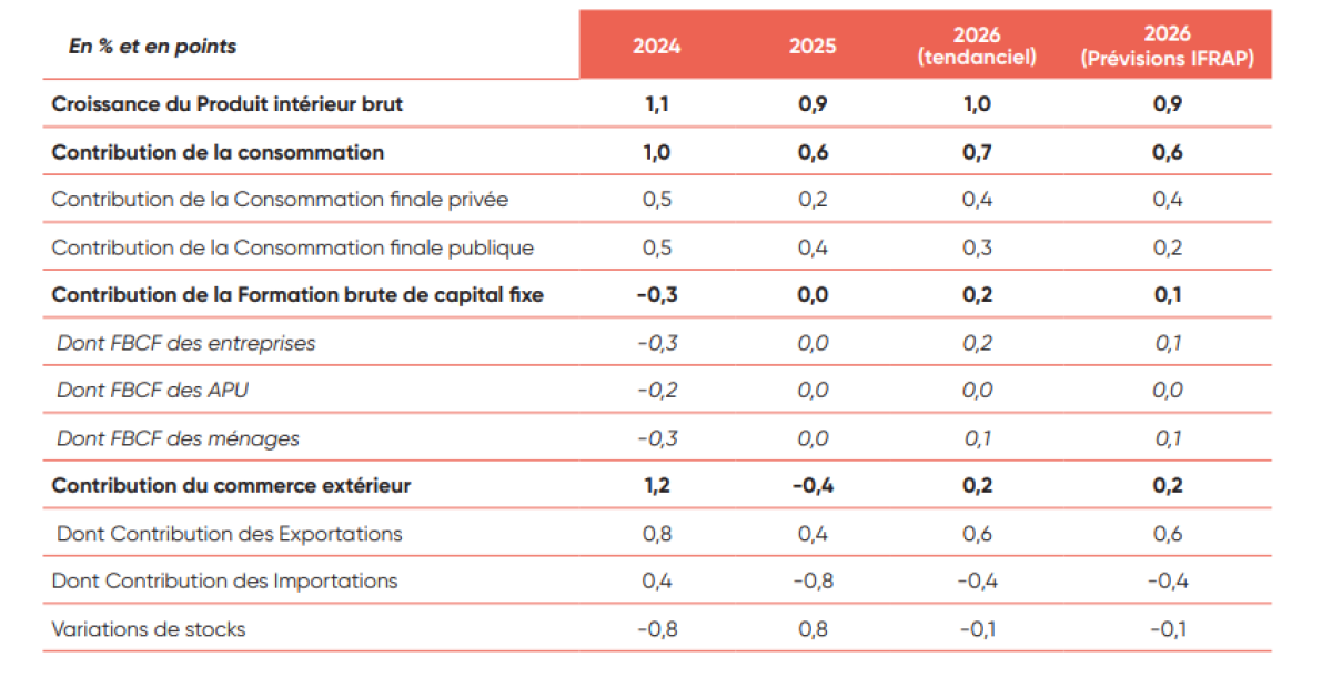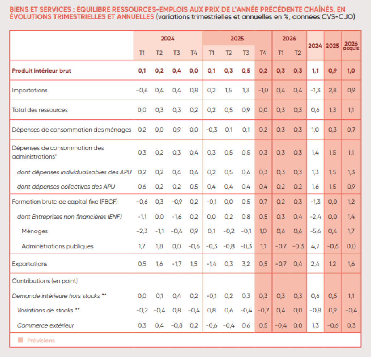 Dans sa dernière note de conjoncture parue le 17 décembre, l'Insee table sur une croissance de 0,9 % pour 2025 et un acquis de 1,0 % de croissance pour les deux premiers trimestres de 2026. Cette croissance serait portée par une contribution du commerce extérieur de 0,3 point et une demande intérieure de 1,1 point, reposant notamment sur un dynamisme de l'investissement des ménages et des entreprises.
