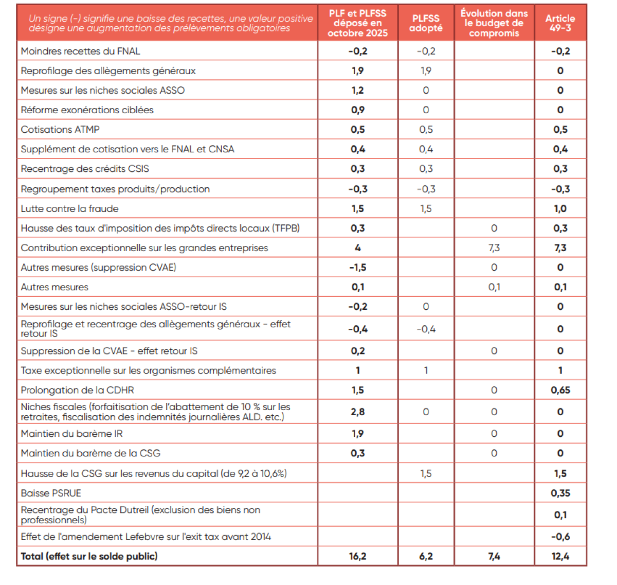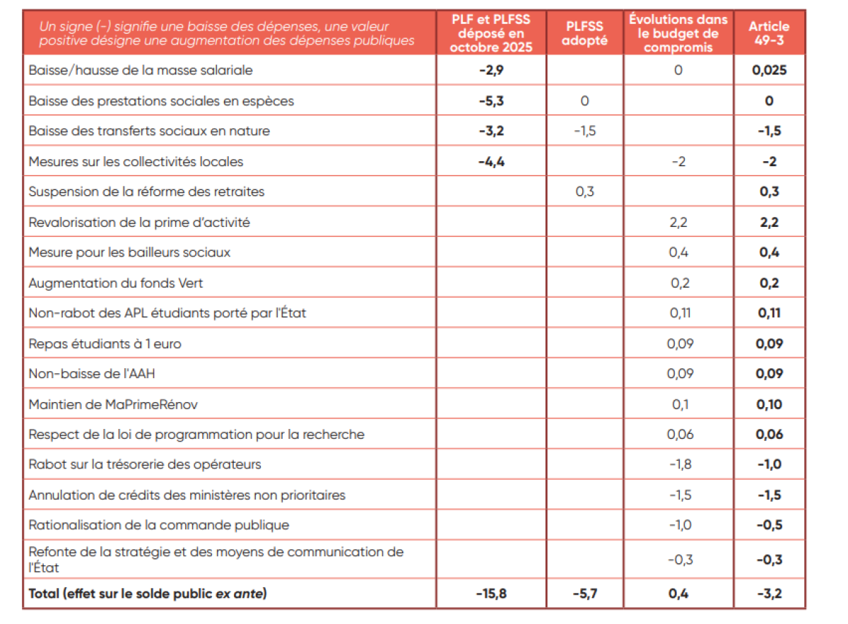 Nous évaluons les effets du budget finalement adopté, comprenant les mesures du PLFSS voté en décembre et les différentes mesures du compromis et adoptées avec l'article 49.3 fin janvier. Comme on peut le constater dans les tableaux suivants, les mesures en recettes représentent un supplément de 12,4 milliards d'euros de prélèvements obligatoires (contre 16,2 milliards d'euros dans le budget déposé en octobre). Les mesures d'économies de dépenses (nettes des dépenses supplémentaires votées) ne sont plus que de 3,2 milliards d'euros, avec de nombreuses dépenses supplémentaires qui sont venues s'ajouter dans le cadre du compromis budgétaire permettant de faire passer le PLF à l'article 49.3.