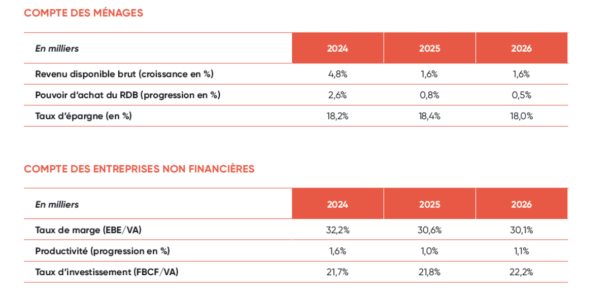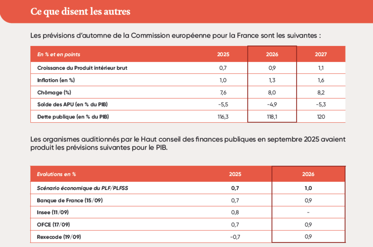 Nous considérons que - hors mesures budgétaires nouvelles par rapport à 2025 (hausse de prélèvements obligatoires et baisse de dépenses publiques) - la croissance pour 2026 atteindrait 1,0%. Cette prévision est une prévision tendancielle sans inflexion majeure des efforts en matière de finances publiques, avec une inflation qui demeurerait contenue. Elle n'a pas vocation à se réaliser puisque des mesures d'ajustement des finances publiques, même légères, vont être mises en œuvre en 2026.