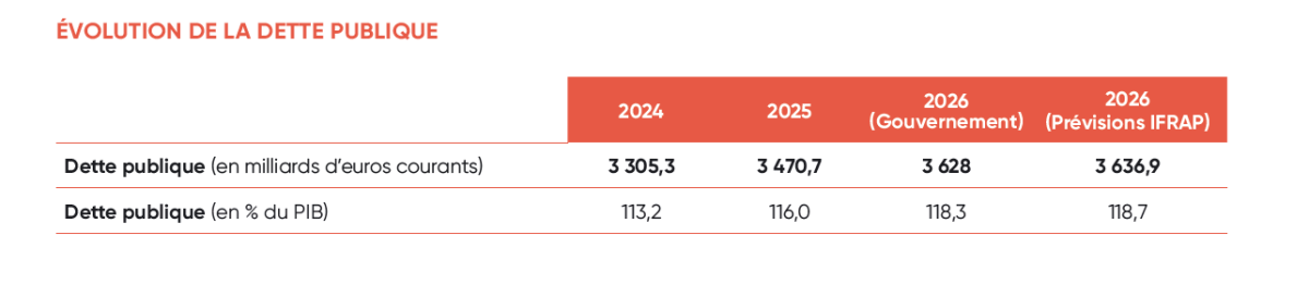En l'absence de mise en œuvre de mesures budgétaires nouvelles en 2026, la dette publique aurait atteint 3 650 milliards d'euros en 2026 (119% du PIB). La mise en œuvre des mesures budgétaires contenues dans le PLFSS voté et le PLF adopté au 49.3 permettront de contenir la dette publique à un niveau de 3 637 milliards d'euros à la fin de l'année 2026 (118,7% du PIB).