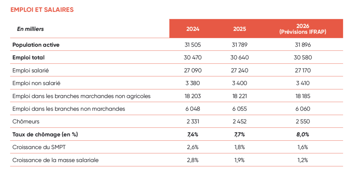 Il y aurait une légère destruction d'emploi en plus d'un léger recul de la population active, du fait de la mesure de suspension de la réforme des retraites qui commencerait à produire de premiers effets en 2026 (quelques départs anticipés). Le chômage remonterait légèrement pour s'établir à 8%.