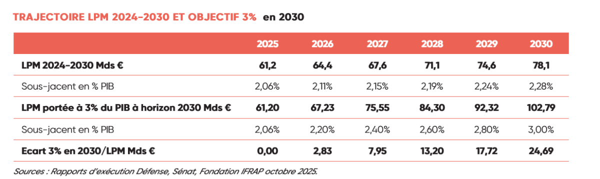 [4] Dominique LEGGE, rapport d'information sur les perspectives de financement des objectifs fixés par la loi de programmation militaire, Sénat, n°615, 14 mai 2025 p.14.