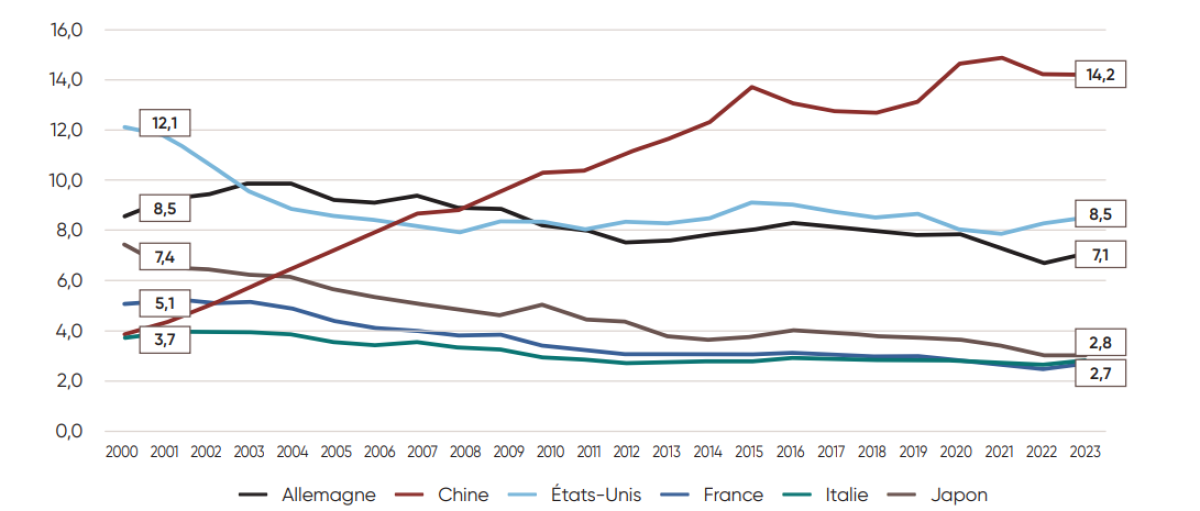La part de marché de la France a eu tendance à décliner ces 20 dernières années. Ce recul est lié à la désindustrialisation de notre pays dont les causes sont connues : trop de prélèvements, trop de normes sur l’appareil productif qui nuisent à la capacité d’autofinancement et fragilisent nos entreprises qui ont recours à l’endettement pour financer leurs investissements.