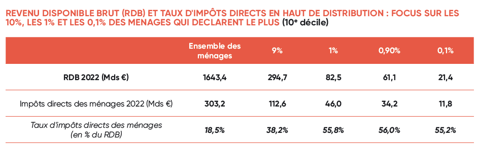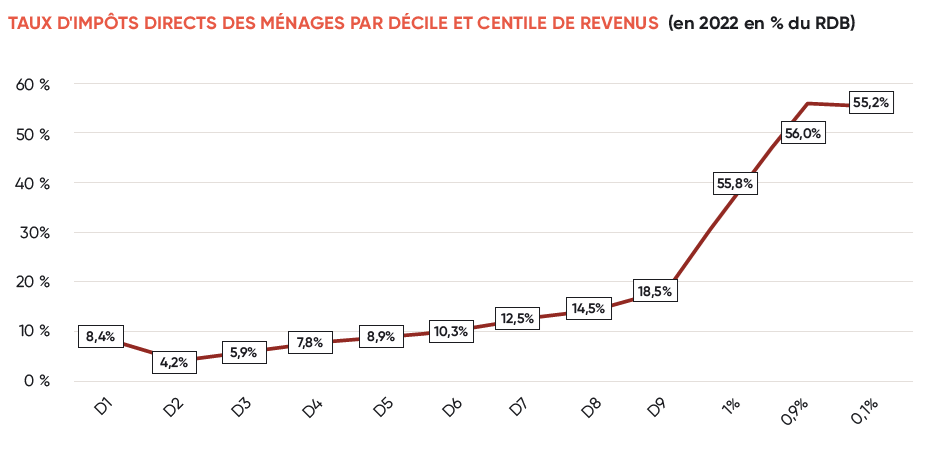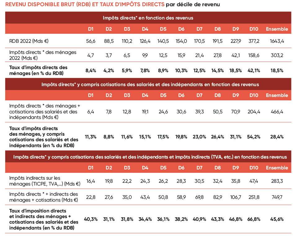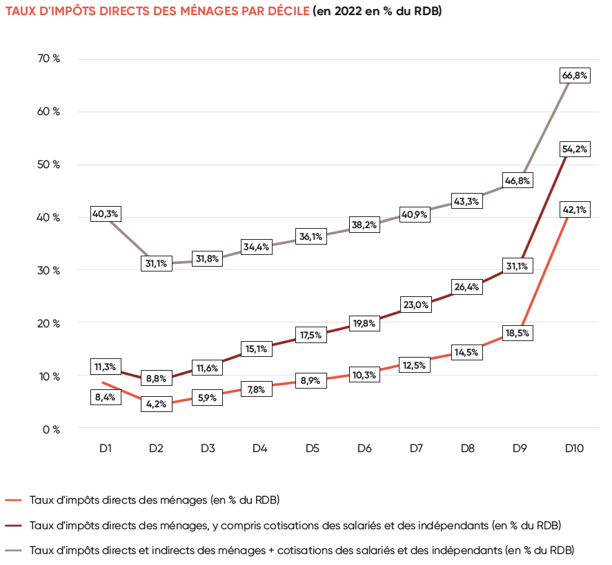 Si l’on retient uniquement les impositions directes (IR, CSG, IFI, etc.), le taux d’imposition du D10 atteint 42,1% soit 158,6 Md€, contre 8,4% pour le D1 (4,7 Md€). Ce taux monte à 54,2% sur le D10 si l’on y ajoute les cotisations des salariés et des indépendants contre 11,3% pour le D1. Enfin, si l'on ajoute encore les taxations indirectes sur les ménages, le taux d’imposition des 10% les plus riches atteint 66,8% contre 40,3% pour les 10% les plus modestes.