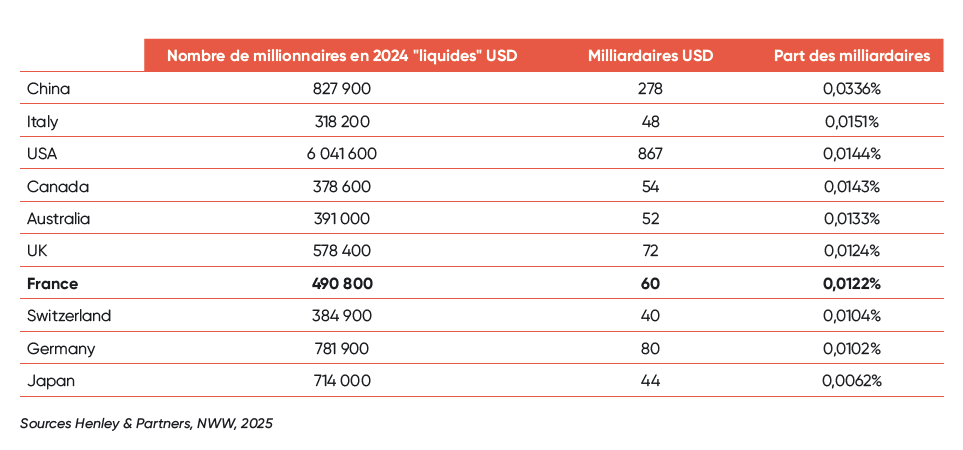 Lorsque l’on regarde la population des milliardaires cette fois, la France, avec 60 milliardaires fait mieux que la Suisse, le Canada et le Japon respectivement. Le top 3 étant trusté par les États-Unis, la Chine ou le Royaume-Uni.