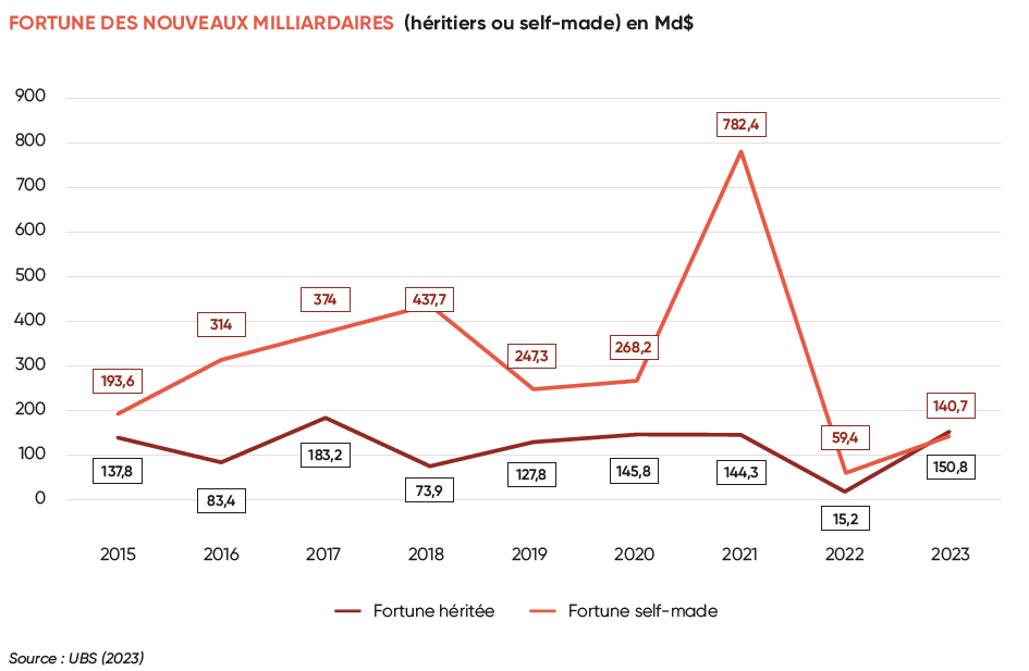 Même si pour la premières fois la fortune des nouveaux entrants héritiers a dépassé très légèrement en 2023 celle des nouveaux milliardaires self-made (de +10,1 Milliards en flux) :