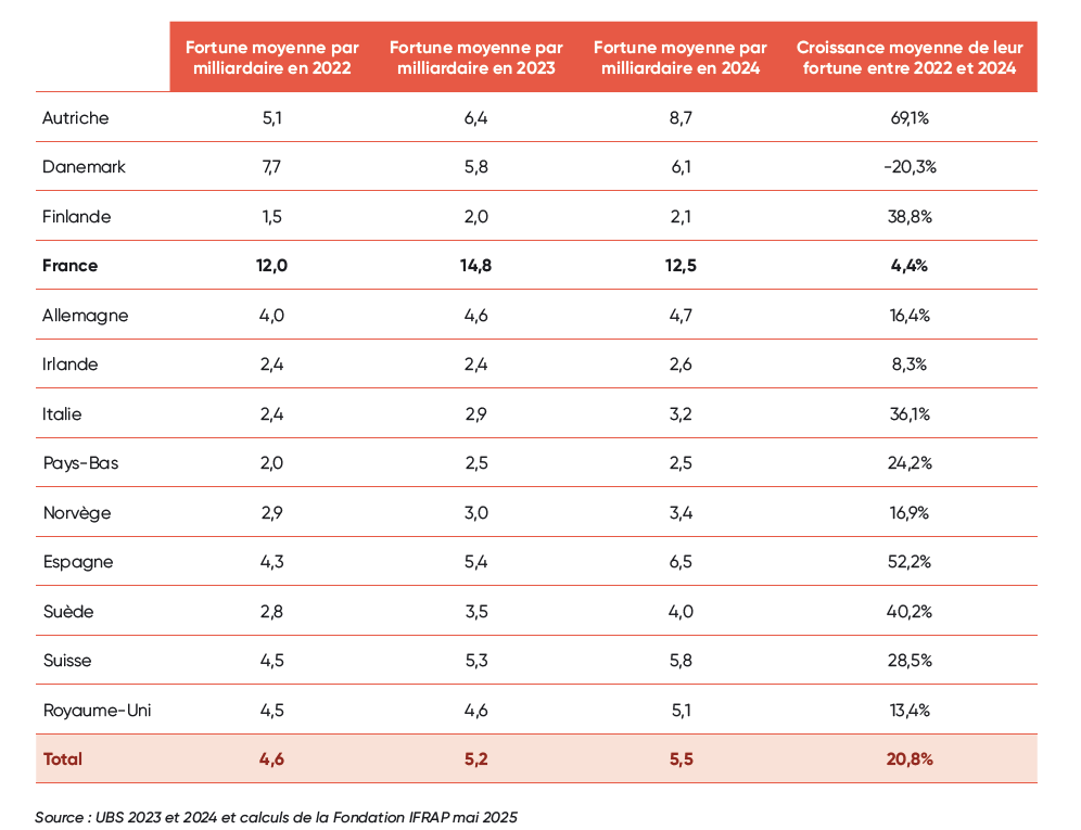 Au sein de l’Europe, la situation des milliardaires français est atypique : en 2024 la France comptait 46 milliardaires soit environ 9,3% de l’ensemble des milliardaires européens, mais leur fortune représentait 21,1% de l’ensemble du total des fortunes. La France se caractérise donc par une population de milliardaires plutôt faible, mais une fortune plus importante.