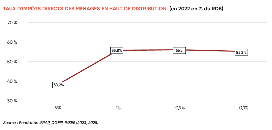 Même si on se concentre sur le 10e décile, loin de constater une régressivité, on observe un taux d’imposition directe qui passe de 38,2% pour les 9% les plus riches, 55,8% pour les 1% les plus riches, 56% pour les 0,9% les plus riches et 55,2% pour 0,1% les plus riches.