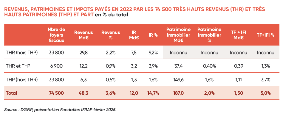 - Revenus et patrimoines des foyers les plus aisés en France, DGFIP, janvier 2025