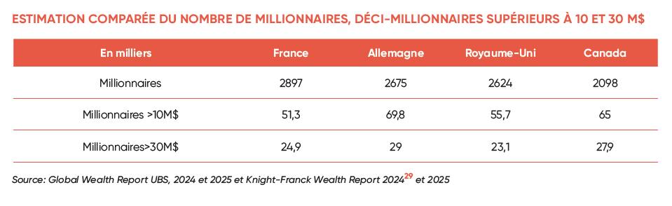 Si l’on utilise maintenant les données 2023, s’agissant des multi-millionnaires dont la fortune est supérieure à 30 M$, notre situation est plus enviable que celle du Royaume-Uni (24 900 contre 23 100) mais moins que celle de l’Allemagne (près de 29 000) ou du Canada (27 900).